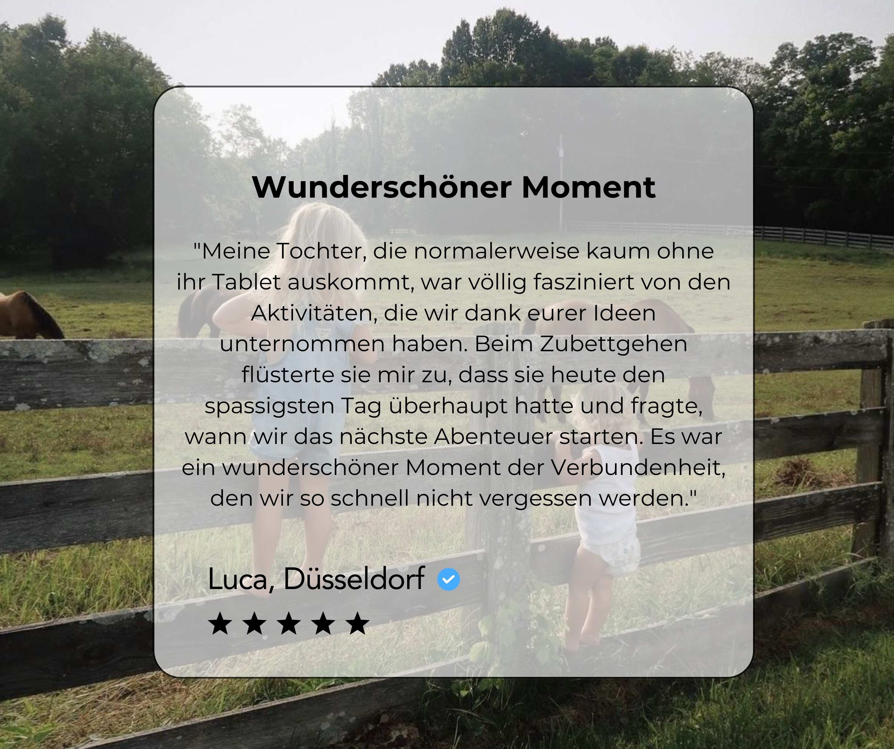 Unsere Ideen zeichnen sich durch ihre einzigartige Kombination aus Zugänglichkeit, Flexibilität und Fokus auf echte, unvergessliche Erlebnisse aus. Wir legen Wert darauf, dass jede Familie, unabhängig von ihrem Budget, qualitativ hochwertige Zeit miteinander verbringen kann. Unsere Abenteuer sind speziell darauf ausgerichtet, Kinder weg von Bildschirmen und hin zu echten Erlebnissen zu führen. Durch unsere eigenen Erfahrungen als Eltern und das Testen jeder Aktivität mit unseren Kindern stellen wir sicher, dass jede Idee nicht nur Spass macht, sondern auch zur persönlichen Entwicklung beiträgt. Unsere Abenteuer sind für alle zugänglich, da sie mit öffentlichen Verkehrsmitteln erreichbar sind und für jedes Alter massgeschneiderte Optionen bieten. Dadurch, dass wir die Aktivitäten in drei Alterskategorien unterteilt haben, garantieren wir, dass sie altersgerecht sind und sowohl die physische als auch die mentale Sicherheit der Kinder gewährleisten. Diese durchdachte Herangehensweise macht unsere Ideen zu einem unvergleichlichen Erlebnis für Familien, die gemeinsam wachsen und die Welt entdecken möchten.